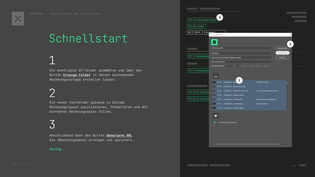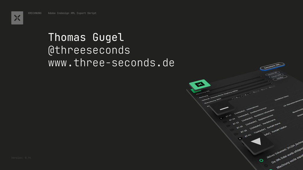 Das Skript wurde entwickelt um Solo-Selbständigen und Kleinunternehmer:innen eine schnelle Loesung fuer die kommende E-Rechnungspflicht zu bieten. Wer bisher Indesign nutzt, kann dies auch weiterhin tun, um nun auch ein XML zu generieren, das entsprechend der EU Norm EN16931 elektronisch weiterverarbeitet werden kann.