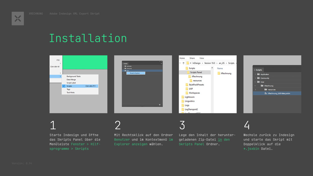 The script was developed to offer solo self-employed and small business owners a quick solution for the upcoming E-Invoicing Ordinance. Those who have been using Indesign up to now can continue to do so in order to generate an XML that can be processed electronically in accordance with the EU standard EN16931.