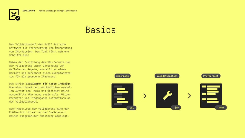 XValidator fuer Adobe Indesign ist ein Skript, dass XML XRechnungen direkt aus Adobe Indesign prueft, indem es einen Aufruf des offline Validationstools der KoSIT startet.